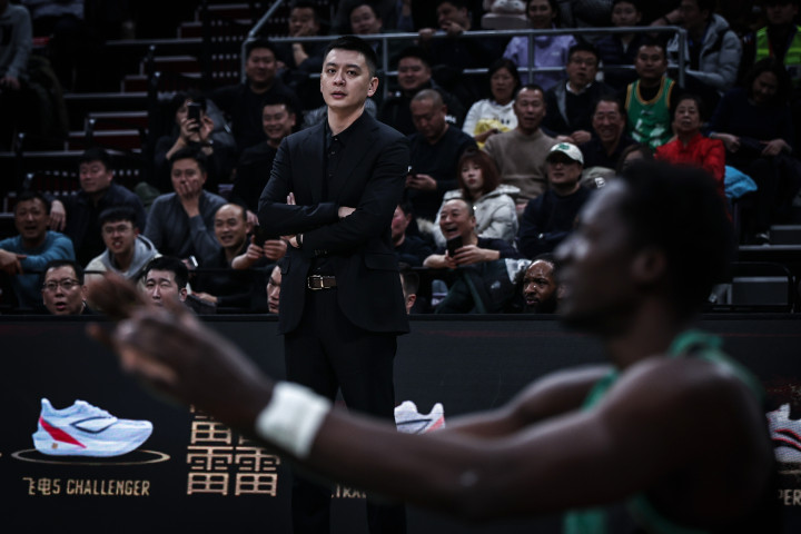 12月20日,辽宁本钢队主扶助杨鸣在场边正式本队球员图雷。新华社记者 潘昱龙 摄