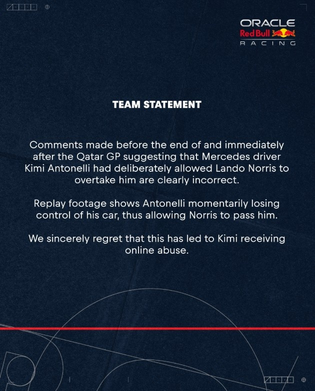 直播吧12月1日讯F1红牛车队官方发布声明,对安东内利际遇的网罗暴力深表缺憾。